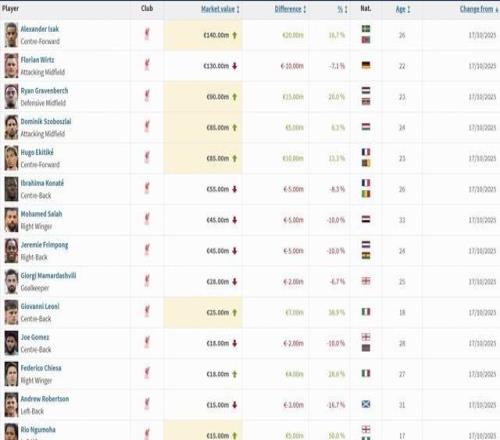 利物浦球员身价变动:伊萨克身价上升2000万欧,维尔茨下跌1000万欧 -